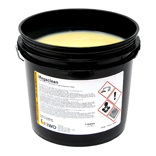 MEGA CLEAN ACTIVE is a fast-acting combination solvent and haze remover viscous gel for the removal of most ink stains and emulsion residue on the screen. It is formulated so it can be brushed or coated onto the screen and rinsed off with water within a few minutes of application.