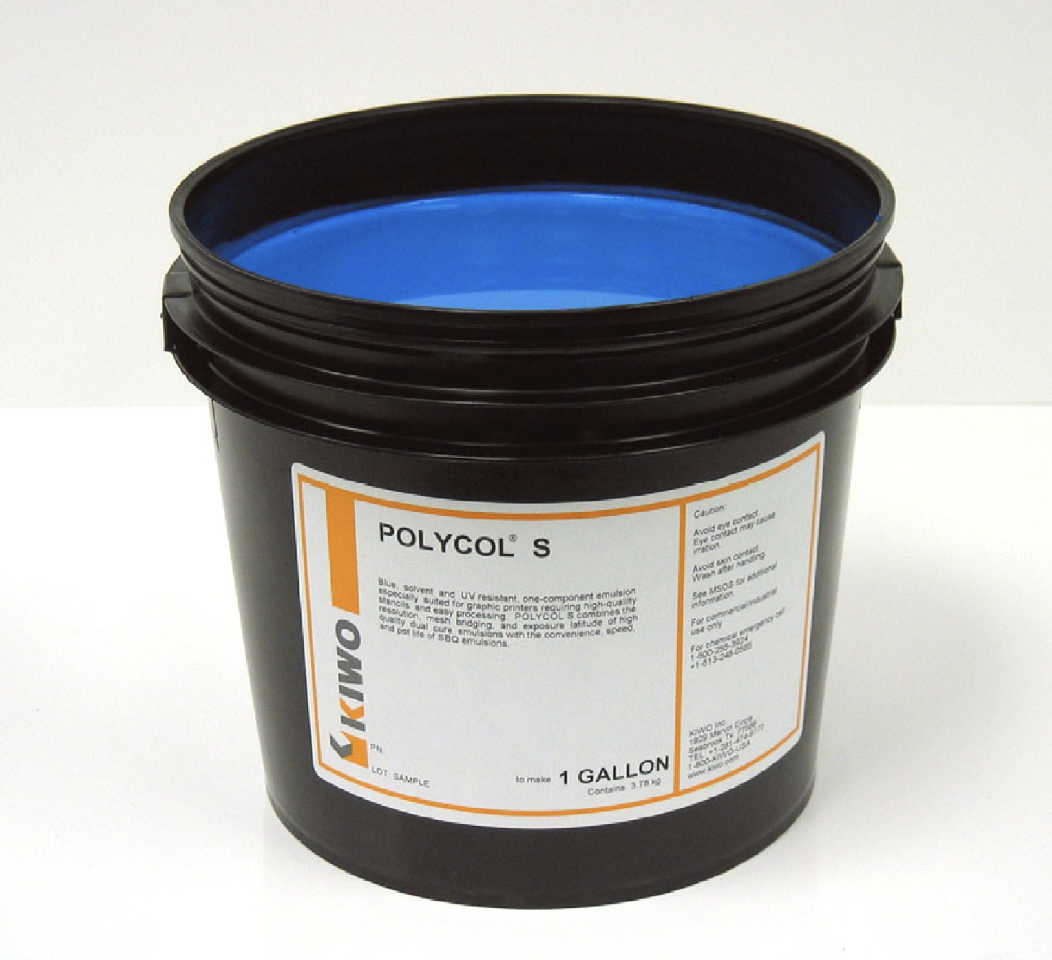 POLYCOL S is a blue, solvent and UV-resistant SBQ emulsion formulated for graphics printers. POLYCOL S provides all the great features of our #1 selling dual-cure emulsion KIWOCOL POLY-PLUS S – outstanding resolution, edge definition, and mesh bridging, combined with excellent exposure and processing latitude. POLYCOL S, however, is a one-component, pre-sensitized emulsion with a one-year pot life and exposure speeds 3-4 times faster than dual-cure emulsions. This product reclaims easily and is a great choice for large-format printers.